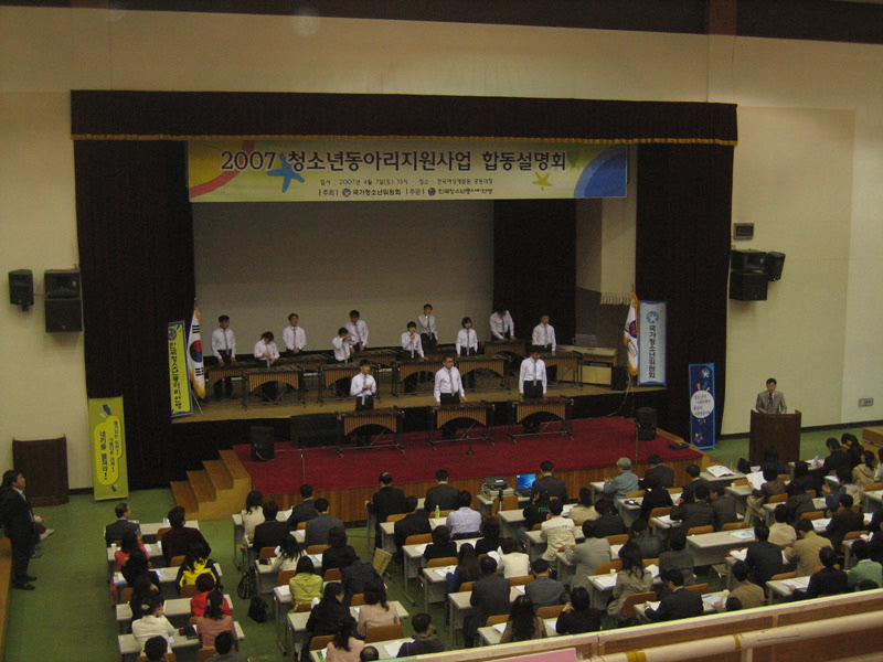 서울 여성회관에서 동아리 지원 사업이 열렸다. 무대 는 정신지체학생들로 이루어진 실로폰 악단의 축하 공연 |