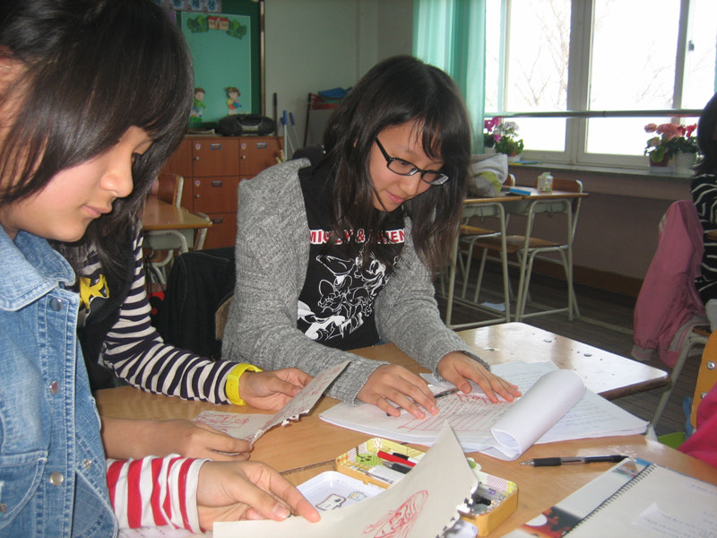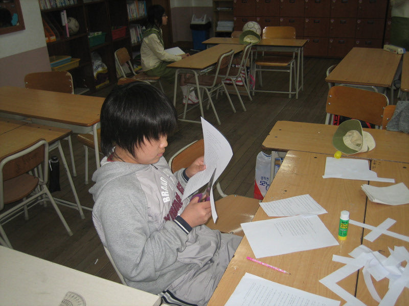 민욱이는 묵묵히 대본을 공책에서 오려 붙이고 있다. |