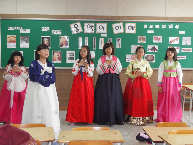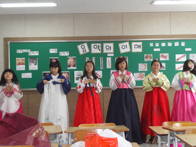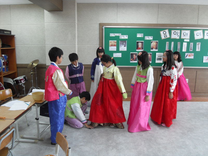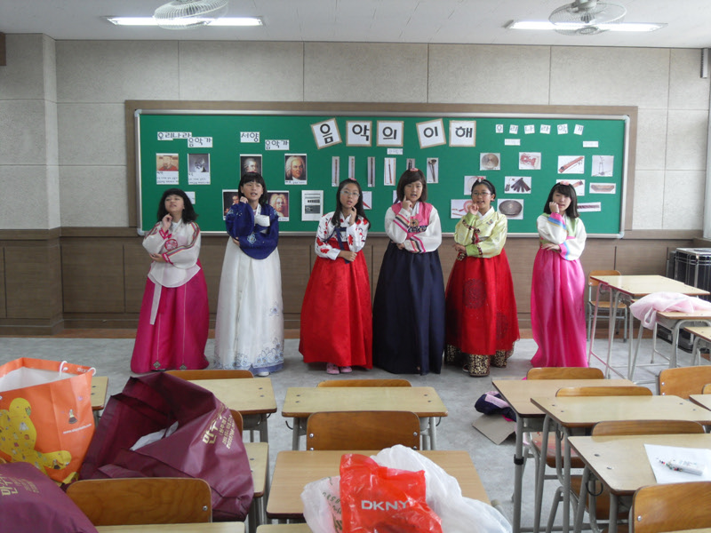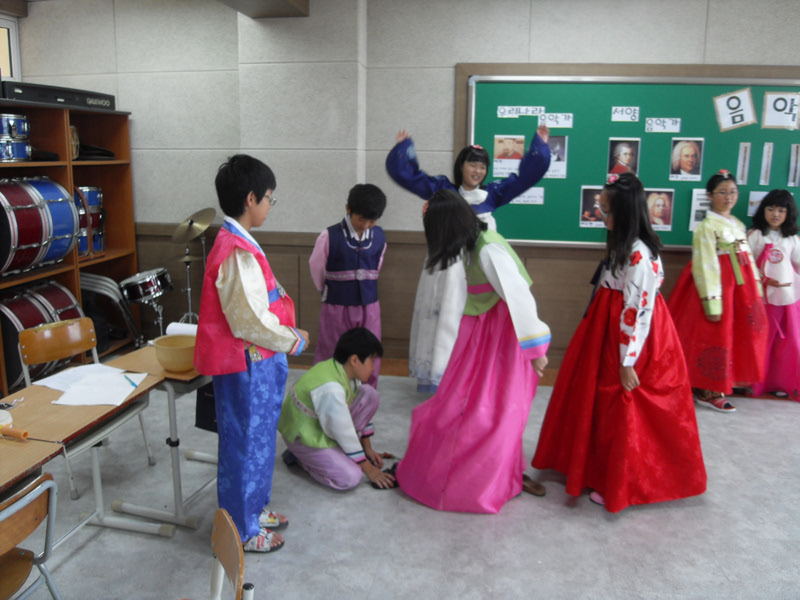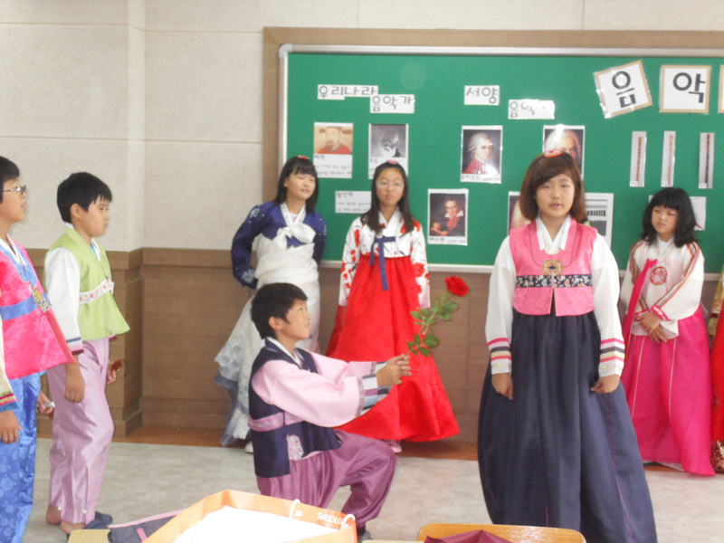 출국 2일전 학교는 교육과정 워크샵이 열려 240명이 넘는 손님들로 북적였다. 우리반 교실은 분임토의 장소로 써야 하기 때문에 연습실을 음악실로 옮겼다. 어짜피 내일 최종 리허설을 해야 하기 때문에 넓직한 음악실에서 연습을 하고 리허설을 하기로 계획했다. 문제는 더위.. 아이들은 에어컨이 나오지 않는 가운데 한복을 입고 연기하느라 고생이 많다. 그동안 충분치 않은 시간이었지만 어느정도 뮤지컬이 완성이 되었다. 솔직히 많이 모자르기는 하지만 태국을 방문하는 목적이 공연보다는 교류에 있음으로 크게 욕심내지 않기로 했다. 또한 태국에서도 연습할 시간이 있음으로 더욱 보완해 나가면 된다.