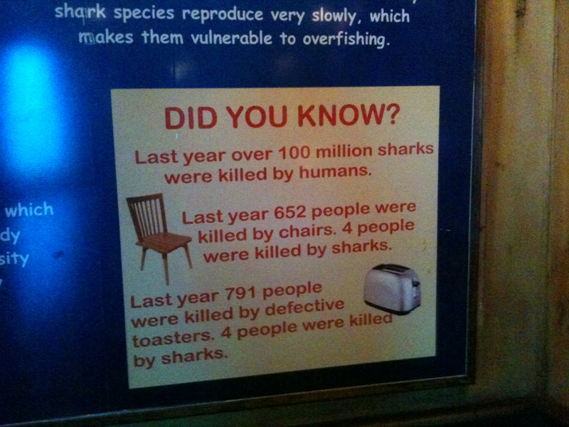 상어 보호 캠페인. 상어는 작년에 652명의 사람을 습격해 4명을 사망케 했으나 인간은 100만마리의 상어를 잡았다는 내용