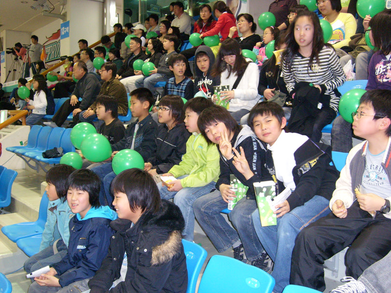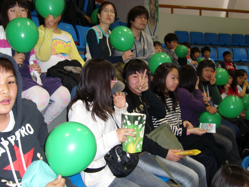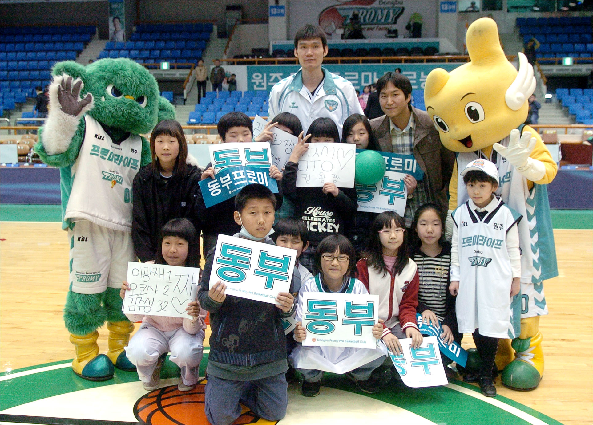 동부 김주성 선수와 함께(3월 19일) 올해 맡은 학년은 6학년 보람반 .. 이러다 6학년 전문이 되는건 아닌지? 그래도 6학년은 나와 는 가장 잘 맞는 학년이지 싶다. 원주 발령 받은 후 첫 이벤트는 치악체육관 에서 일어났다. 원주를 연고로 하는 동부 프로미에서 우리학 교 아이들을 초대 했다. 주중인데도 많은 아이들이 관람을 희망했고, 오후 7시 경기가 시작되었다. 이미 우승을 결정지은 동부라 그리 치열하지 는 않았지만 그래도 즐겁게 응원을 했다. 하프타임에 선수 소장품 경매가 있는데 의외 로 참여가 저조하다. 난 김주성 선수 유니폼을 4만원에 낙찰 받을 수 있었다. 무엇보다 경기 종료후 아이들과 함께 김주성 선수와 사진을 찍을 수 있었다. 농구계 최고 스타와의 만남은 짧지만 아이들 에게 꿈을 심어줄 수 있는 계기가 되었을 것이다.