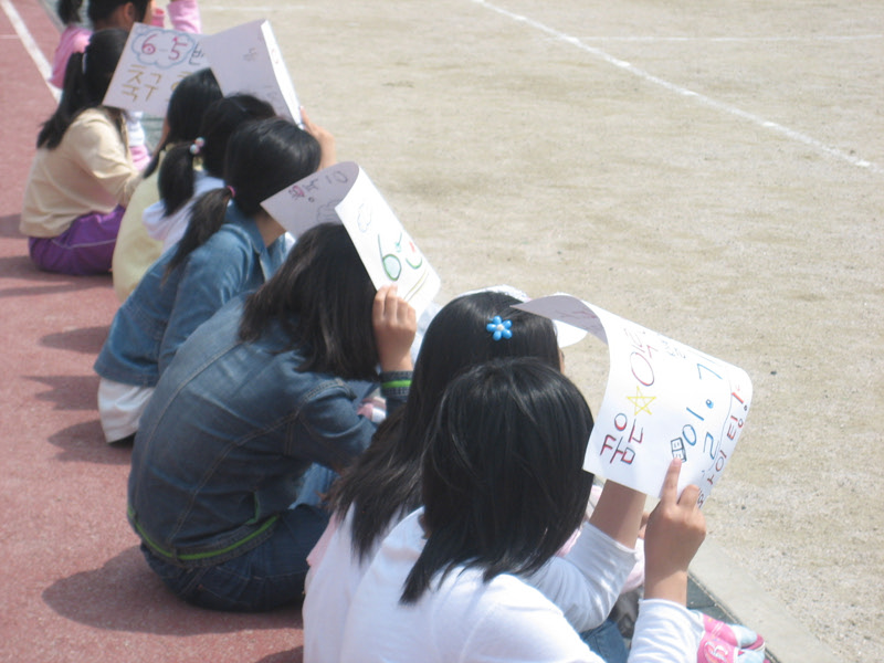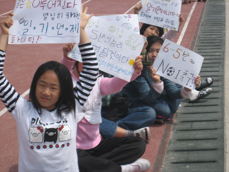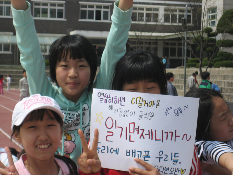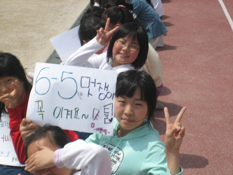 응원문구를 든 아이들. 1종목 우승 할 때마다 일기 1주일을 면제해준다고 공약을 걸었다. |